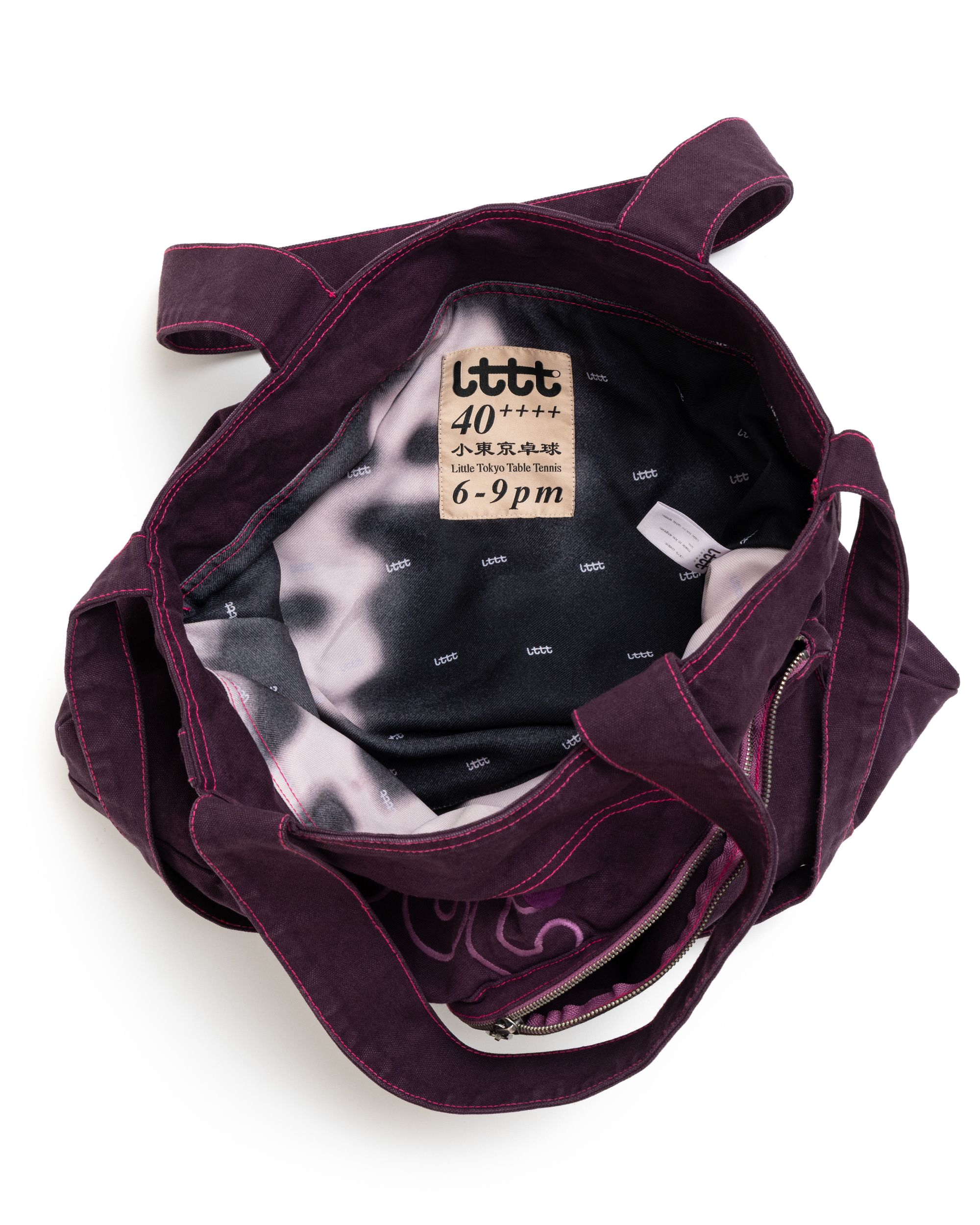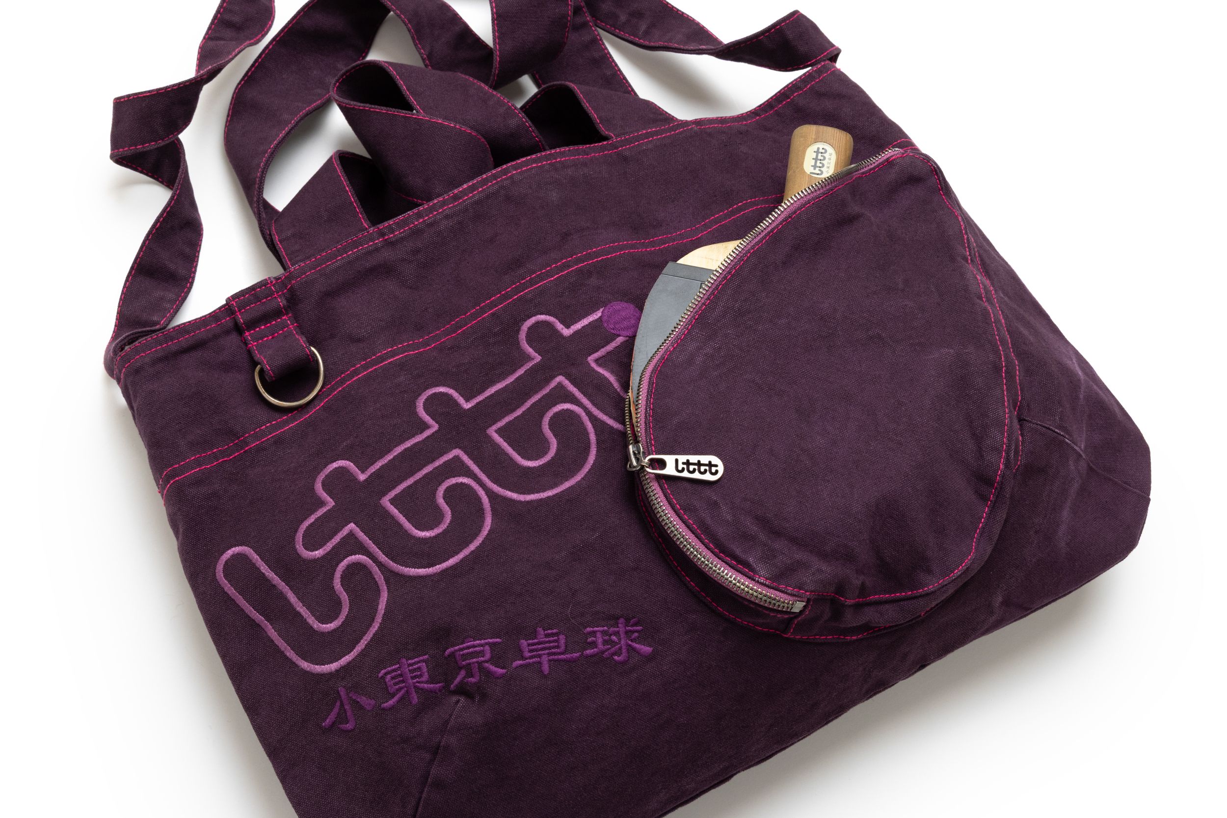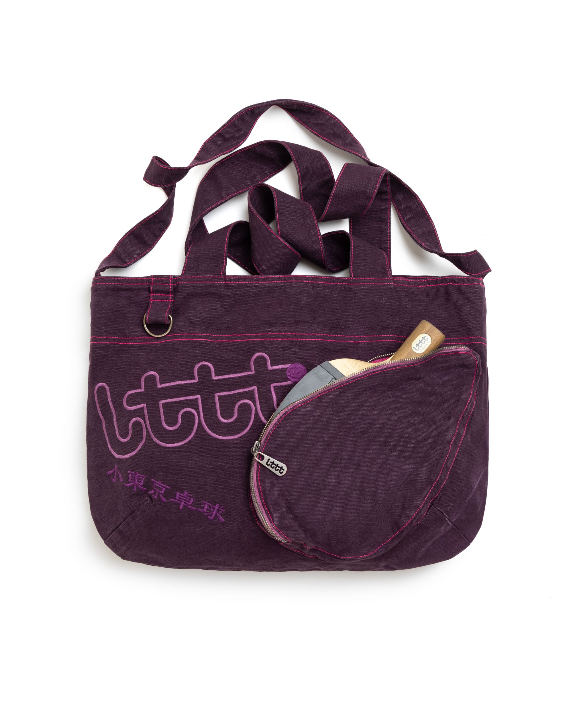 Pyo bag :) designed by Gurina for LTTT. Soft Black and Soft Purple everything you hold has value. it will keep what you love close (ping pong paddle shaped zipper pocket for your ping pong paddle). please use it only to carry things you enjoy as to retain eternal affection for this bag. 100% cotton canvas. 100% cotton lining. LTTT outline embroidery + D-ring. (please note - bags are garment dyed and may have so inconsistencies and fade marks - this makes them special!!!) Dimensions: height 14.5 in. / width 19.5 in. / straps 32.5 in.